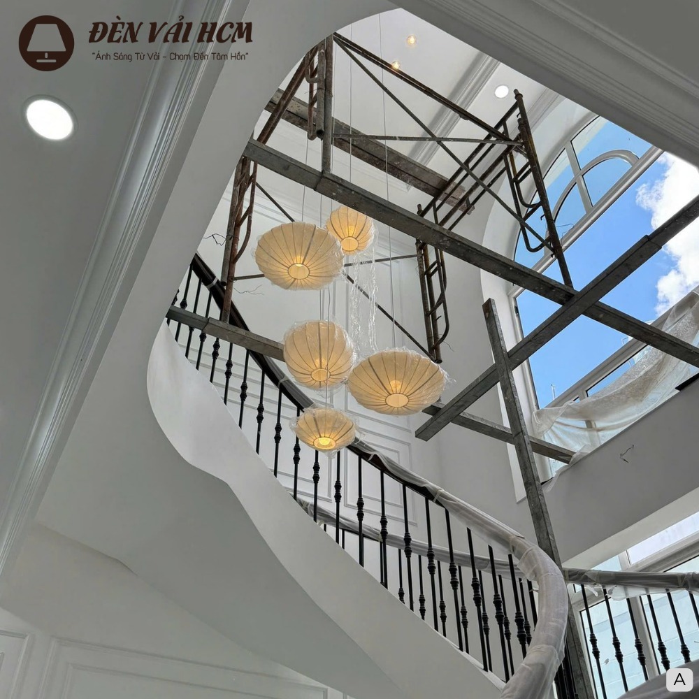 • Trong một số dự án căn hộ cao cấp, chúng tôi đã thiết kế những chiếc đèn vải khổ lớn với hình dáng độc đáo, treo lơ lửng ở khu vực phòng khách hoặc sảnh, biến chúng thành tâm điểm của không gian.